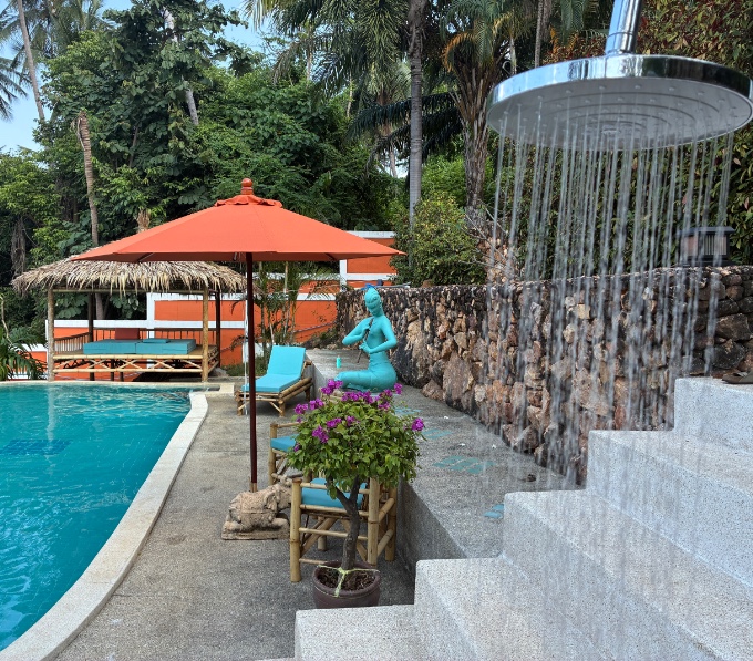 Hier vind je ook de buitenkeuken en eetplek met uitzicht op de palmentuin en het zwembad. Het grote privézwembad (12 x 6 meter) is volledig voor jullie alleen en omheind met een bamboeschutting, zodat je geniet van maximale privacy en rust. Voor extra luxe is er een butlerservice beschikbaar.