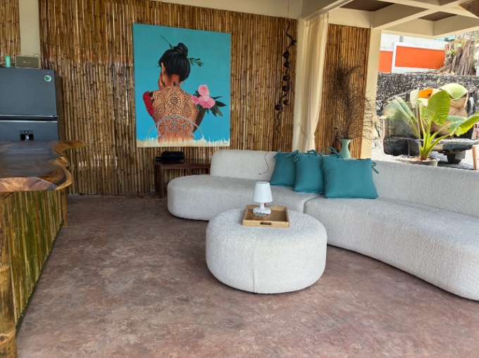 De woning beschikt over twee ruime slaapkamers met airconditioning en twee badkamers: één ensuite bij de master bedroom en één aparte moderne badkamer. Boven bevindt zich een extra woonkamer/binnenruimte met uitzicht op zee. Het echte leefgedeelte is echter de royale overdekte buitenkamer onder het huis: een ruime, open lounge waar je het hele jaar door comfortabel kunt zitten, zelfs tijdens een tropische regenbui.